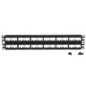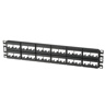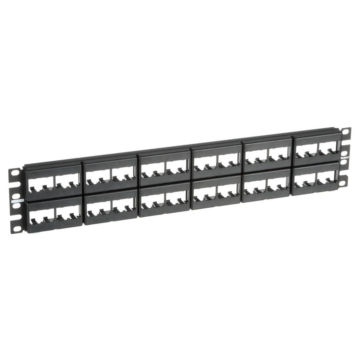 Mini-Com® Patch Panel w/labels accepts up to 48 Mini-Com Modules for unshielded applications in 2 RU and mounts to 19 inch and 23 inch racks and cabinets.