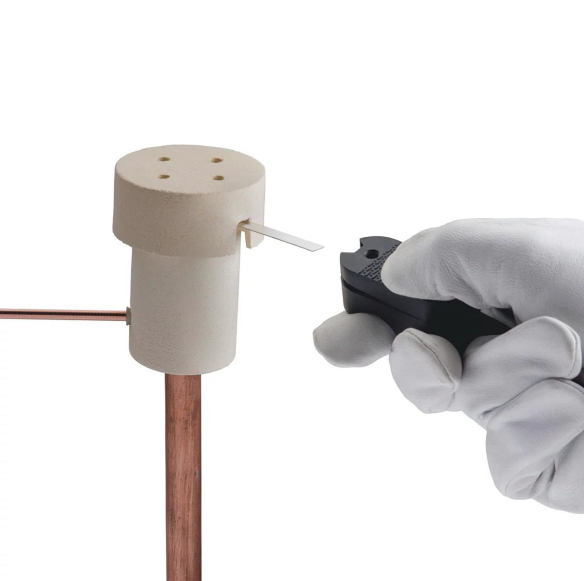 - Connects to the welding material ignition strip with a custom made, purpose-designed termination clip