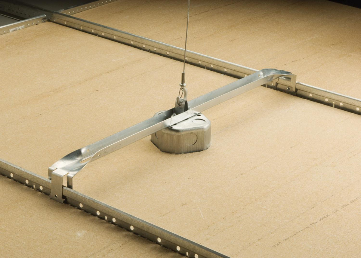 - Fastens to the building structure or hanging services by looping around and hooking to wire rope