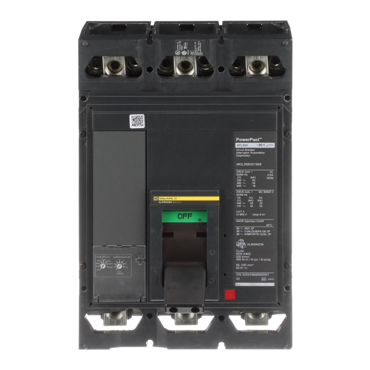 Square D PowerPacT™ MJL Cable-in / Cable-out Molded Case Industrial Circuit Breakers 800 A 600 VAC 25 KAIC 3 Pole