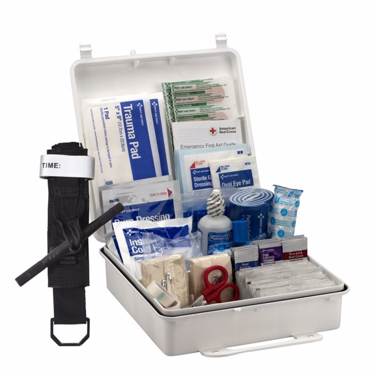 | Includes | Antibiotic, Antiseptic, Bandages, Burn Cream, Burn Dressing, Cold Pack, Conforming Gauze, CPR Face Shield, Emergency Blanket, Eyewash, Gloves, Hand Sanitizer, Scissors, Sterile Eye Pads, Sterile Gauze Pads, Tape, Trauma Pads |