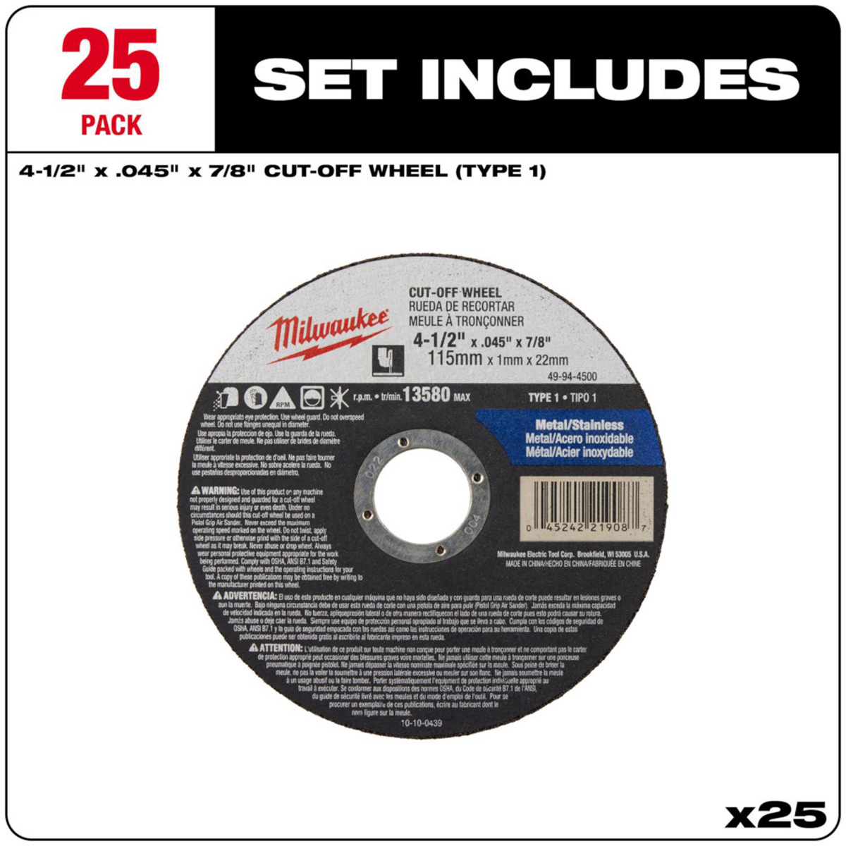 Milwaukee Cut-off Wheels 4-1/2 x 0.045 x 7/8 in T1