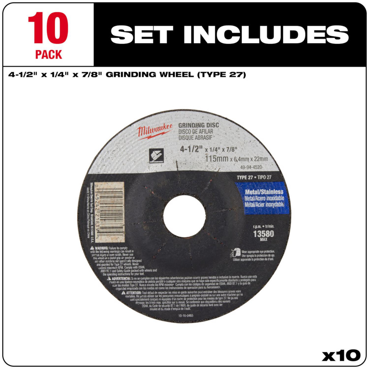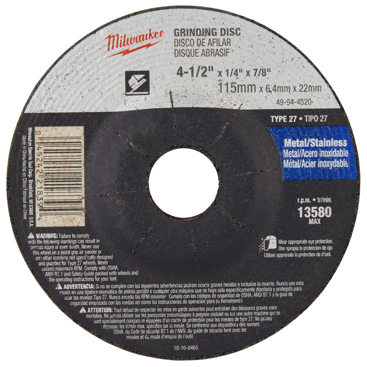 Milwaukee Grinding Discs 4-1/2 x 1/4 x 7/8 in T27 Hard/Extra Coarse