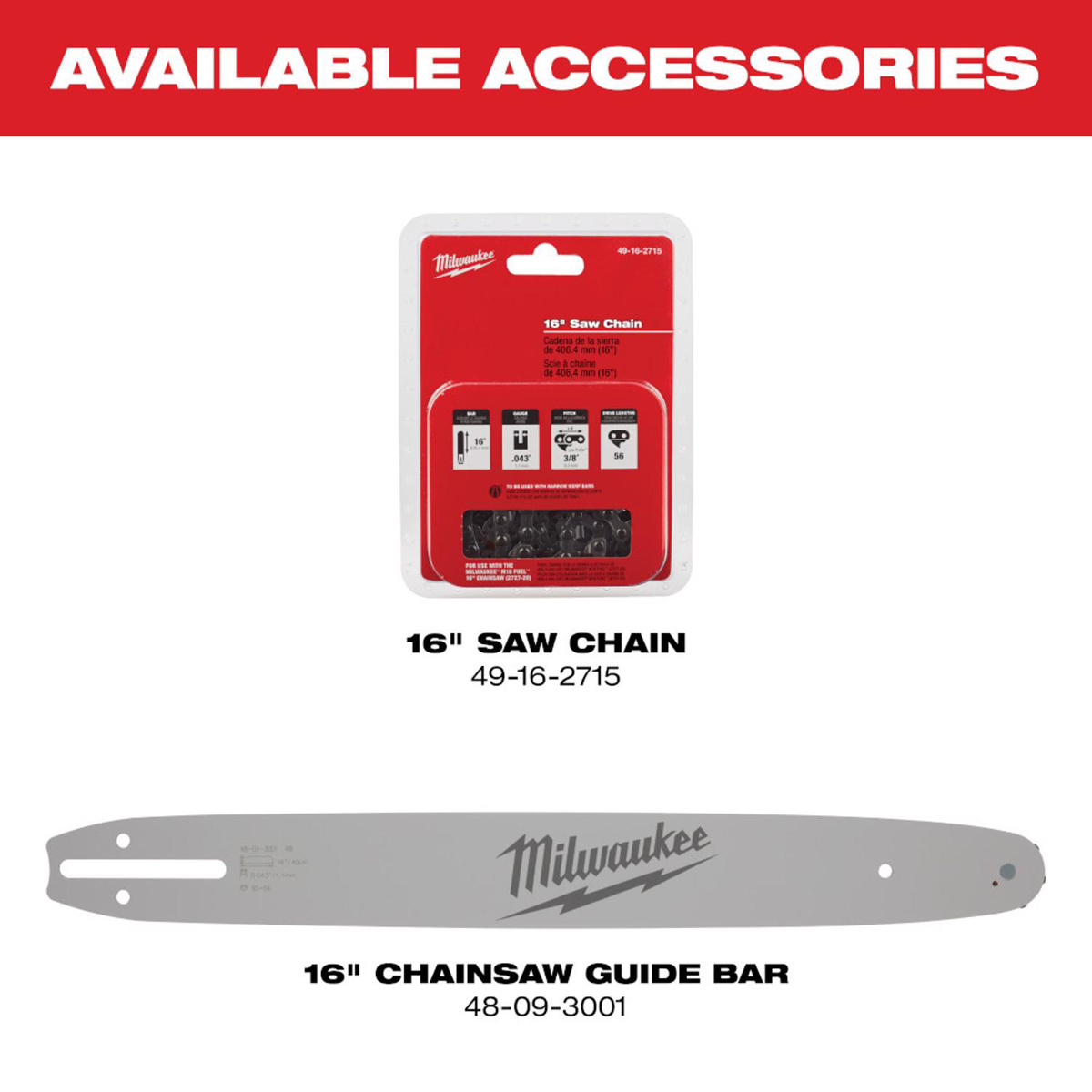 Milwaukee M18™ FUEL™ Chainsaw Kits Cordless 16 in 3/8 in Pitch, 0.043 in Gauge Dual Handle - Top and Rear