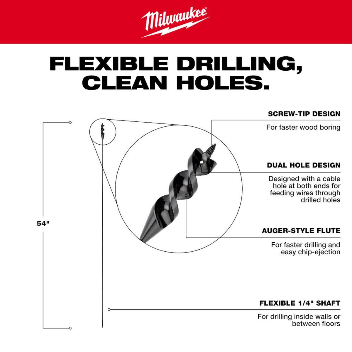 Milwaukee Screw Point Cable Auger Drill Bits 3/4 x 54 in 3 Flat Shank