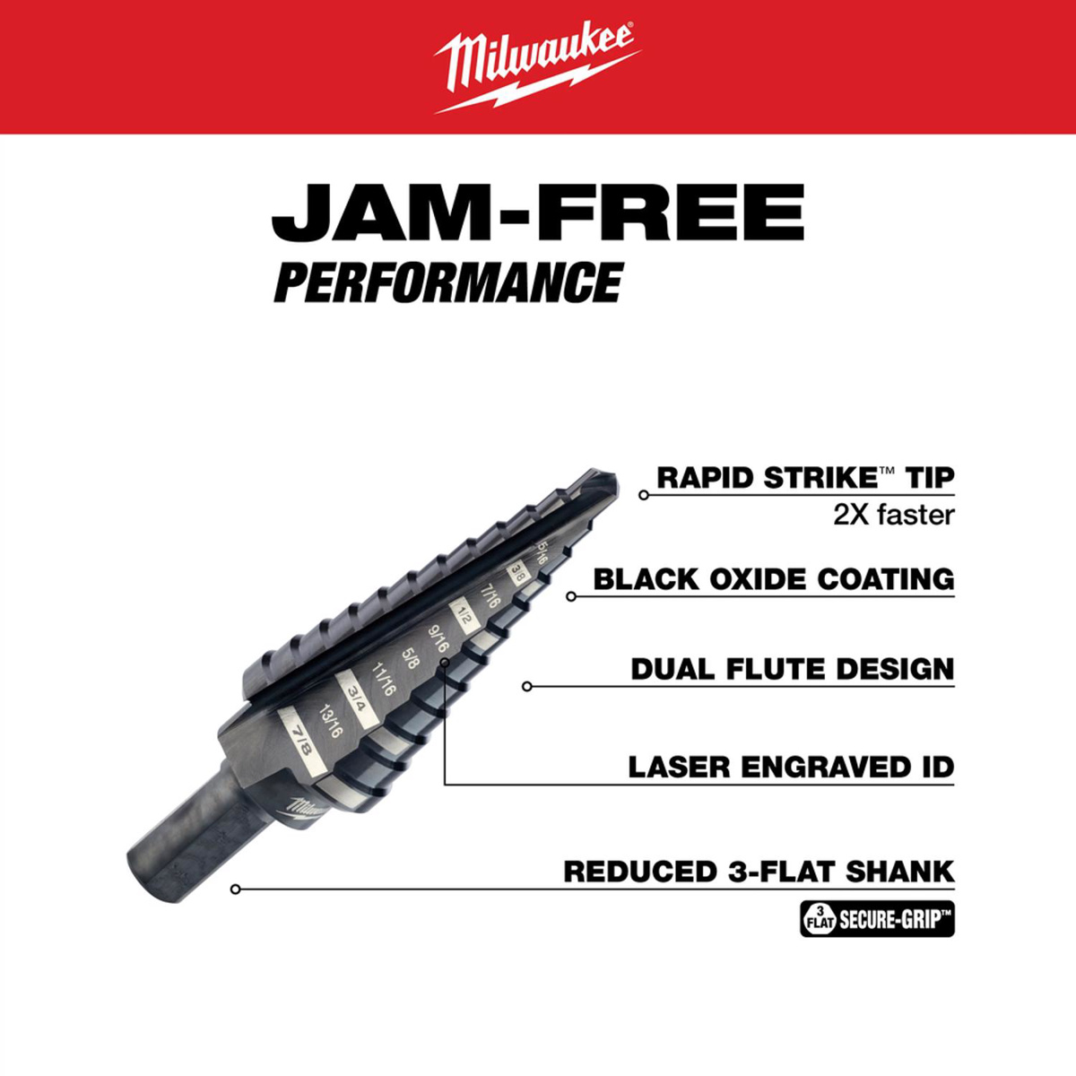 Milwaukee Jam-free Step Drill Bit Sets 3 Piece Black Oxide 1/8 - 7/8 in Dual Flute